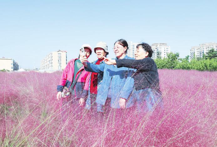 近日,粉黛乱子草迎来盛花期。大片粉色花海如梦似幻,宛如童话世界。众多市民和游客慕名而来,漫步其中,欣赏美景,拍照留念。